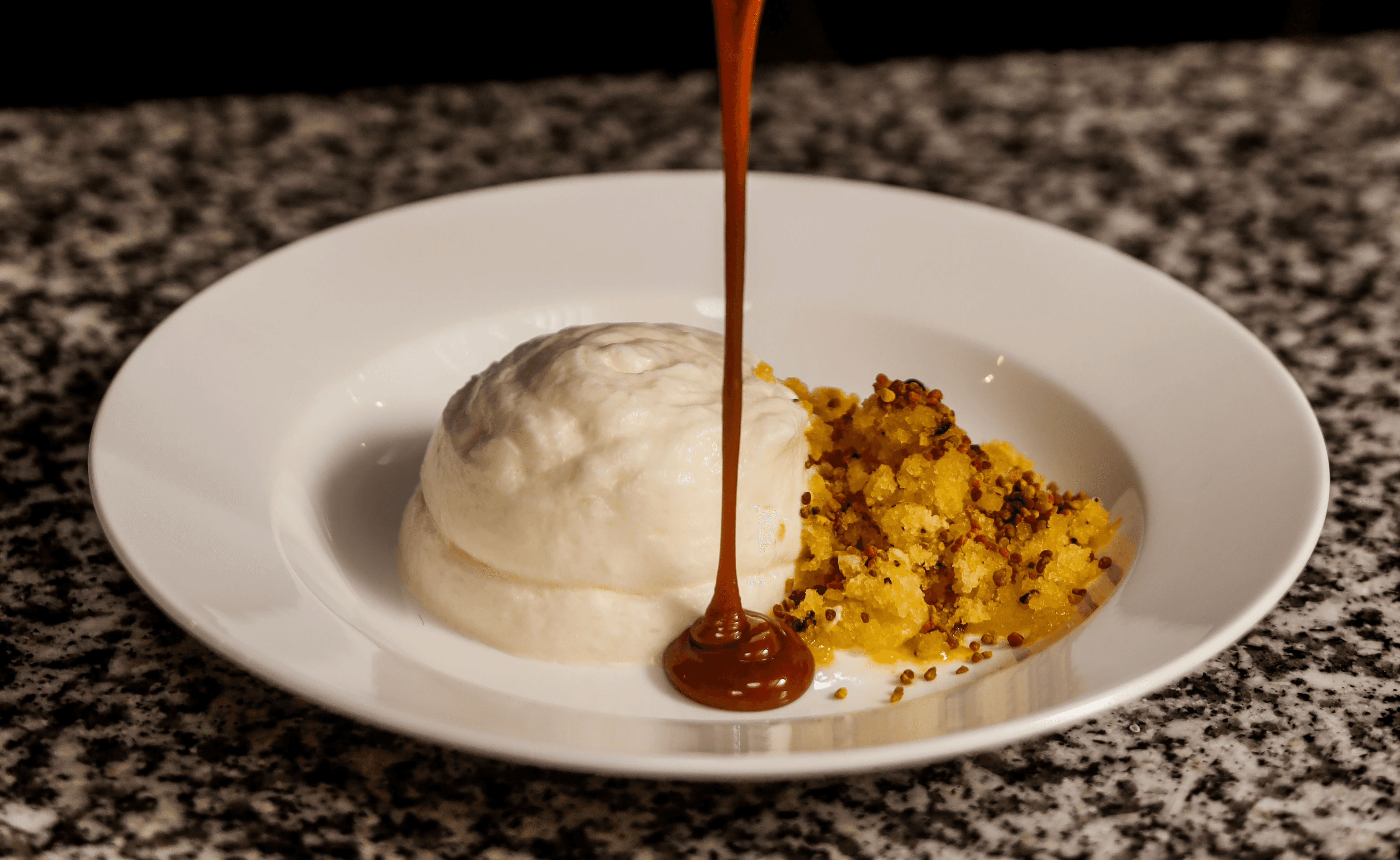 Condensed milk foam Passion fruit granita Bee pollen Salted butter caramel